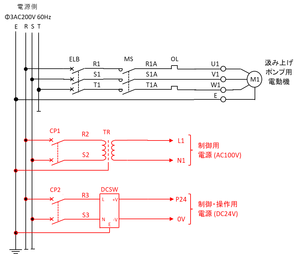Khi nhấn nút khởi động (PB1, thường mở) trong mạch điều khiển 24V, dòng điện từ P24 qua PB2 (thường đóng) đến cuộn hút relay trung gian RY1, kích hoạt RY1 và đóng tiếp điểm thường mở (NO) để duy trì mạch tự giữ. Đồng thời, tiếp điểm thường mở (NO) của RY1 trong mạch điều khiển cấp nguồn 100V cho cuộn hút contactor MS . Khi MS được kích hoạt, các tiếp điểm lực MS trong mạch động lực đóng, cung cấp điện ba pha qua rơ le nhiệt đến động cơ, khởi động máy bơm.